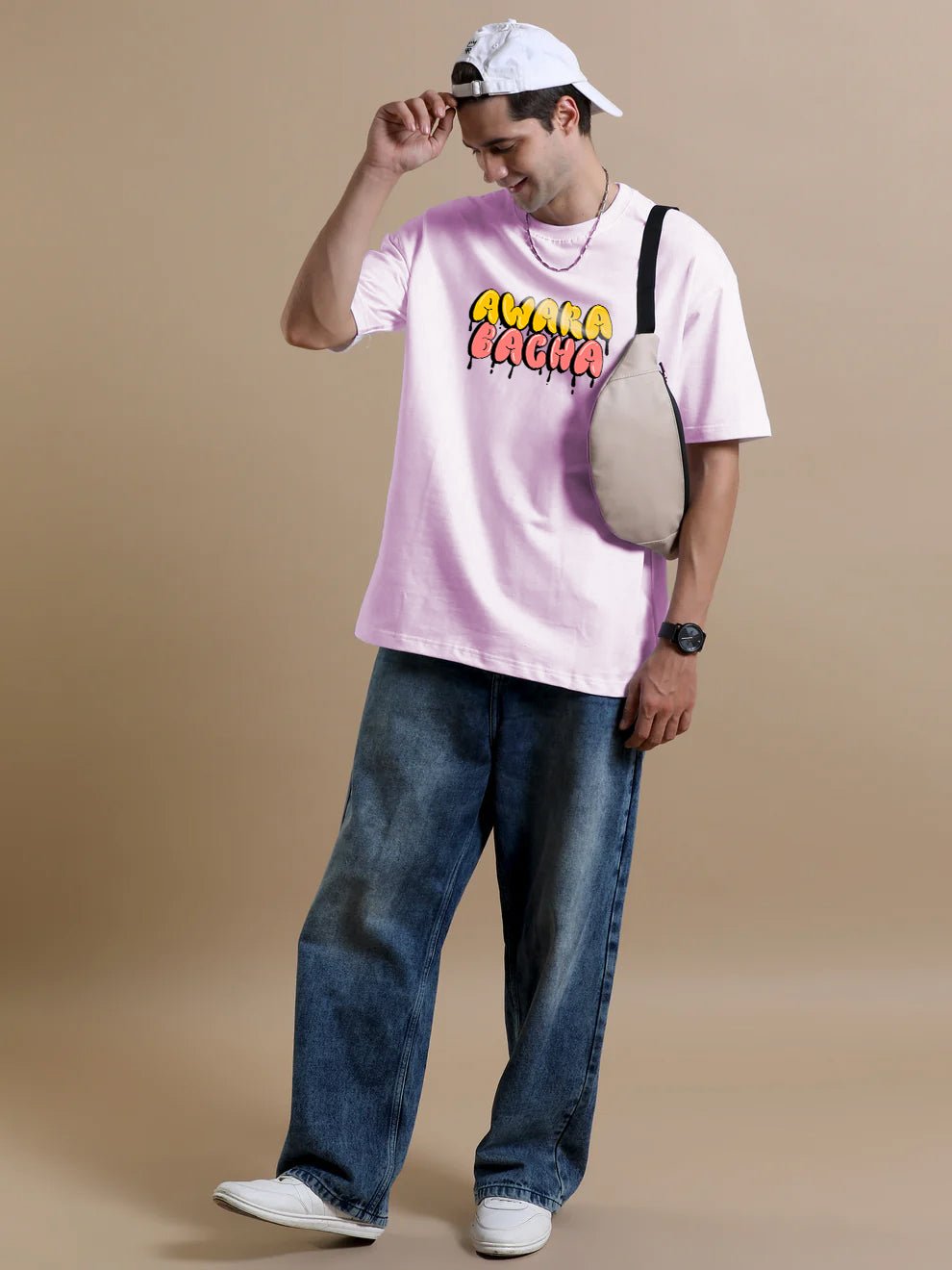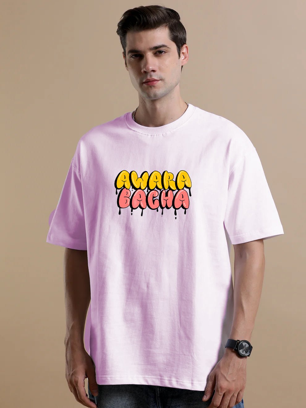 Show off your bold spirit with this oversized tee featuring the playful Awara Bacha text design on the front. Perfect for those who embrace a carefree adventurous vibe with a touch of attitude.