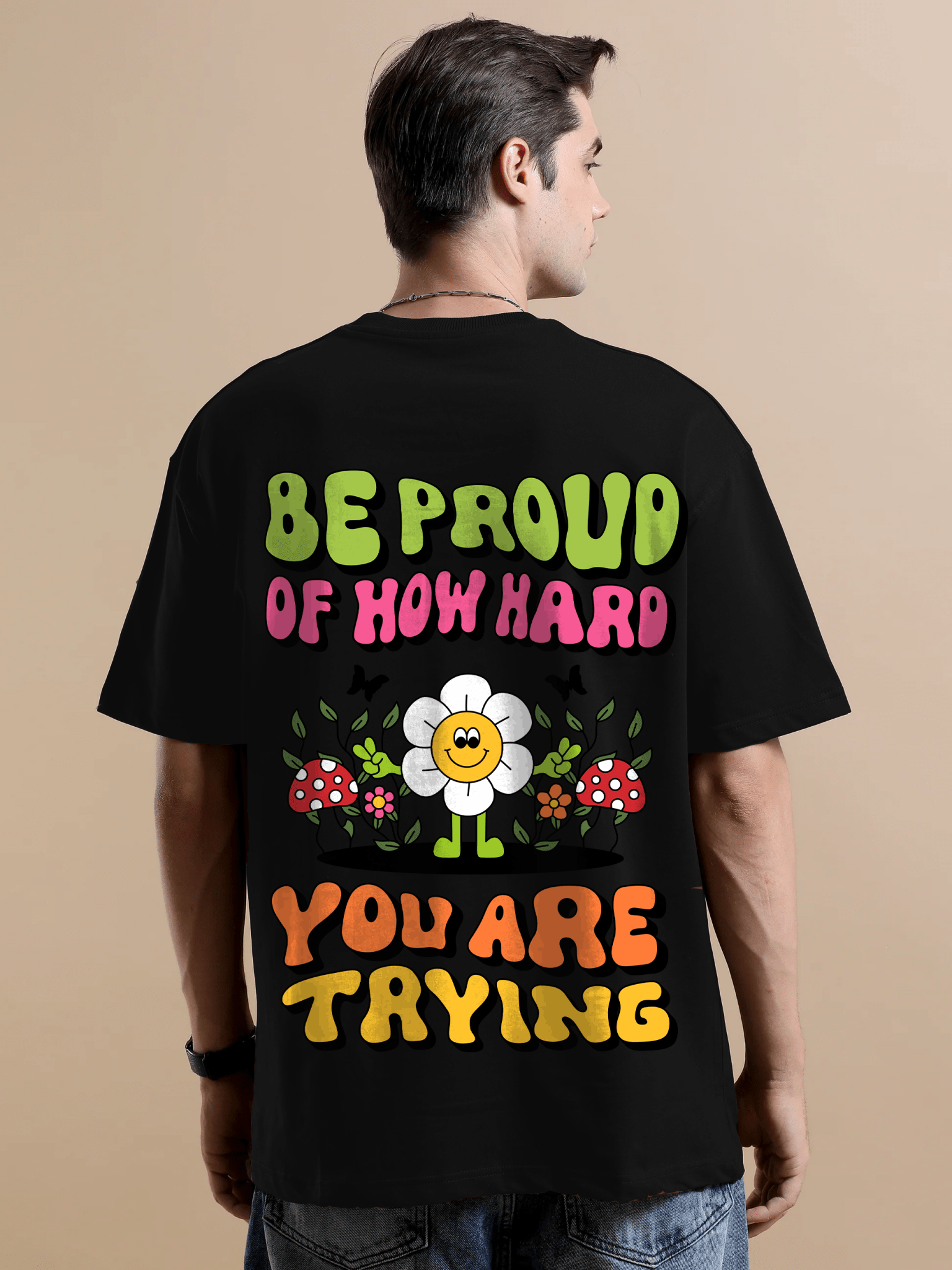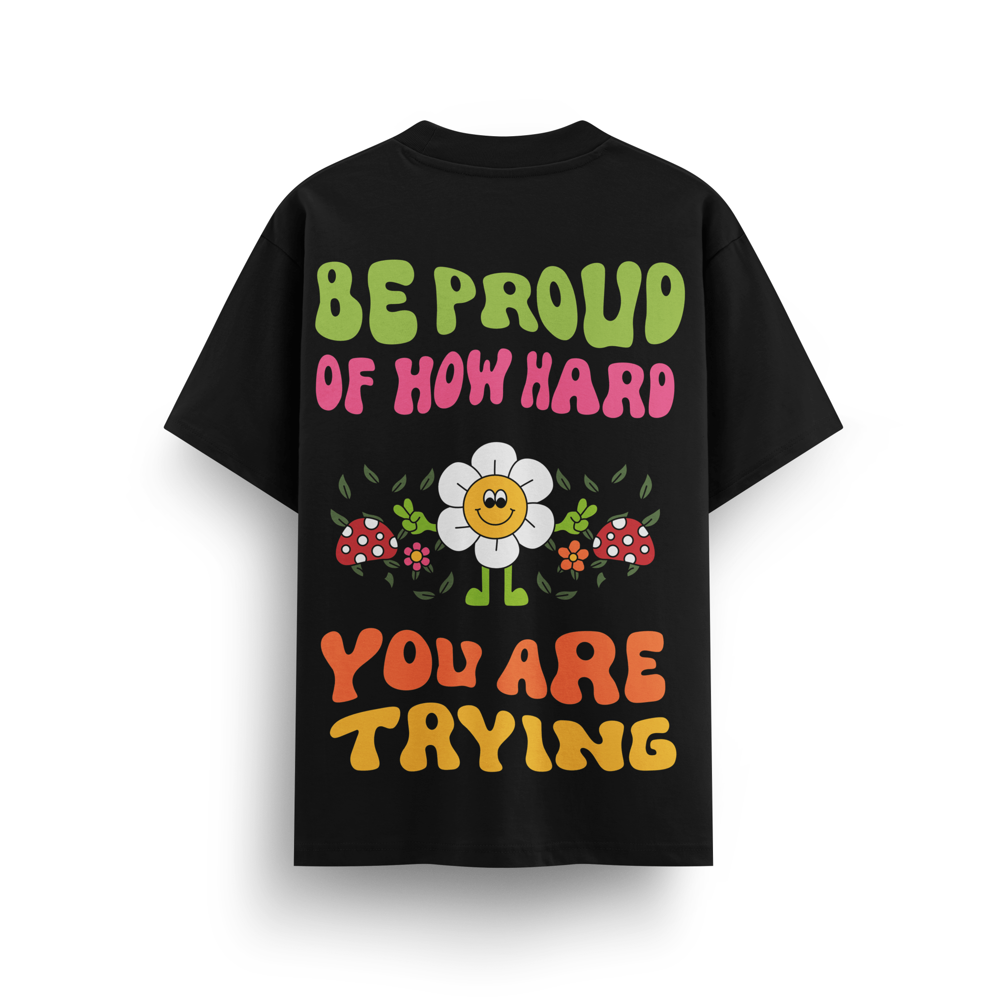 Stay motivated in style with this oversized tee, featuring an inspiring "Be Proud of How Hard You Are Trying" design on the back and bold Hustle text on the front. Perfect for dreamers, doers, and go-getters!
