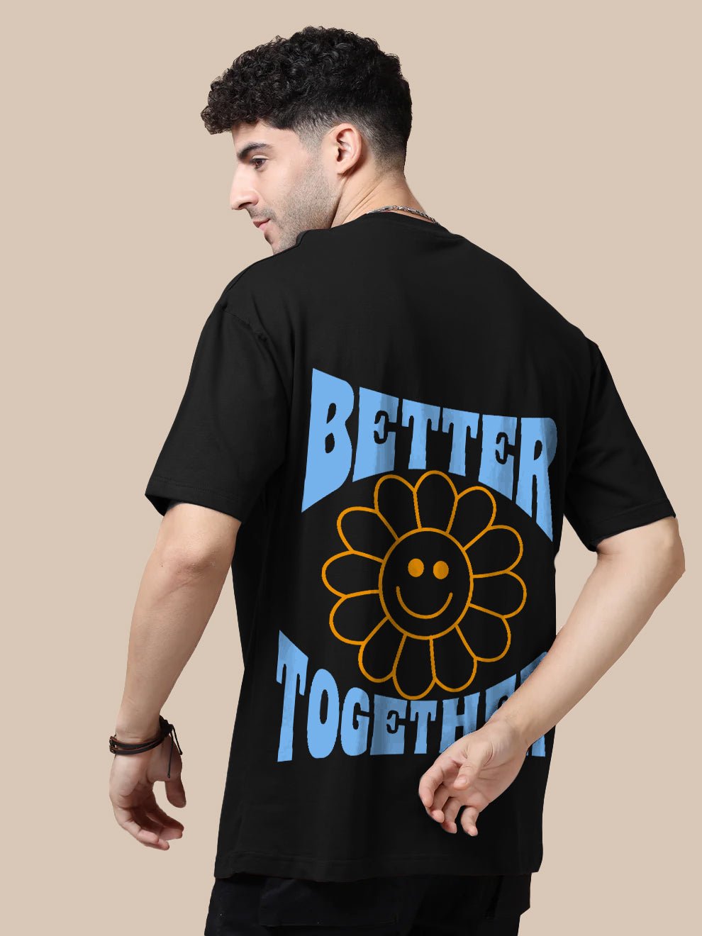 Keep it uplifting with this oversized tee featuring a sleek Better text design on the front The back completes the message with Better Together and more feel-good text perfect for spreading unity and good energy wherever you go.