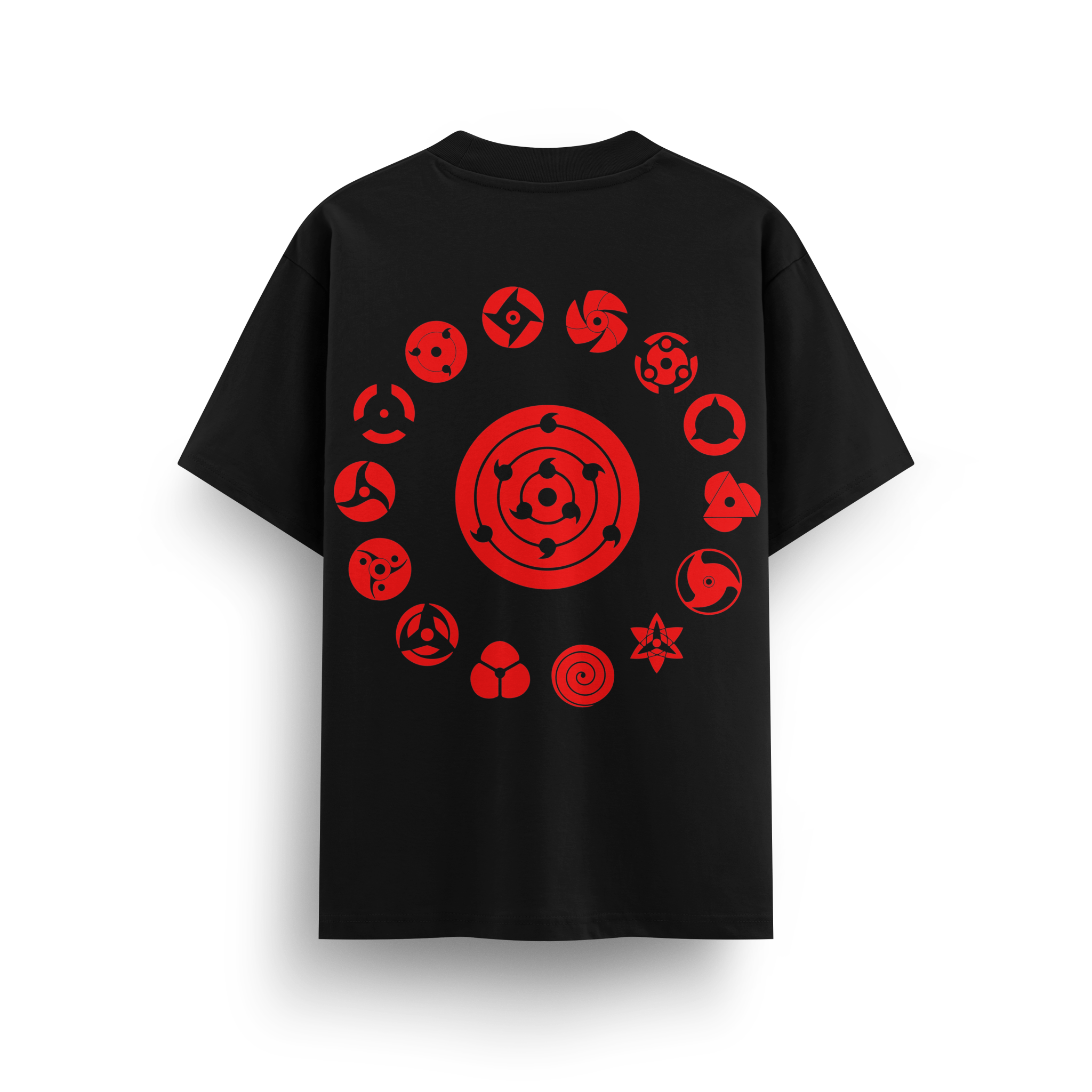 Unlock your inner power with this oversized tee, featuring all Sharingan eye symbols on the back and bold Anime Eyes text on the front. A must-have for every true anime and Naruto fan!