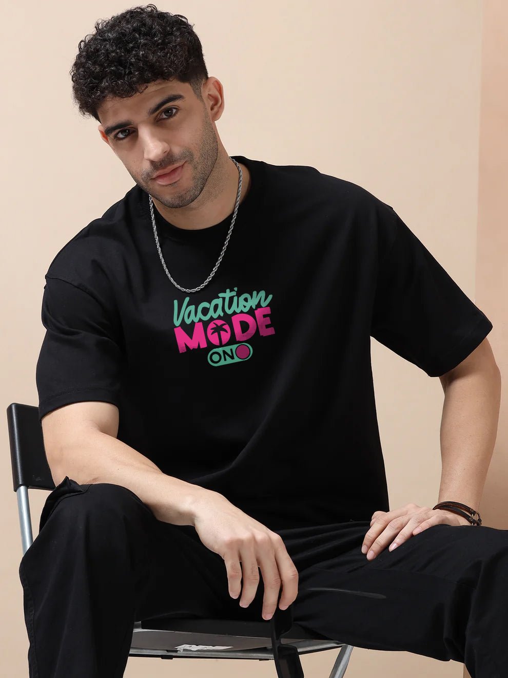 Get into a relaxed vibe with this oversized tee featuring a bold Vacation Mode On text design on the front Perfect for those who love to embrace laid-back style and dream of endless getaways.